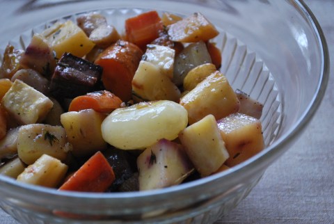 Clean, peel, and cut all vegetables, onions, and garlic and place in a large roasting pan. Toss with olive oil and thyme leaves until well coated. Season with sea salt and pepper to taste. Roast in the oven at 425 degrees for about 30 – 45 minutes until tender and sweet. Toss with maple syrup and serve warm alongside pretty much anything.