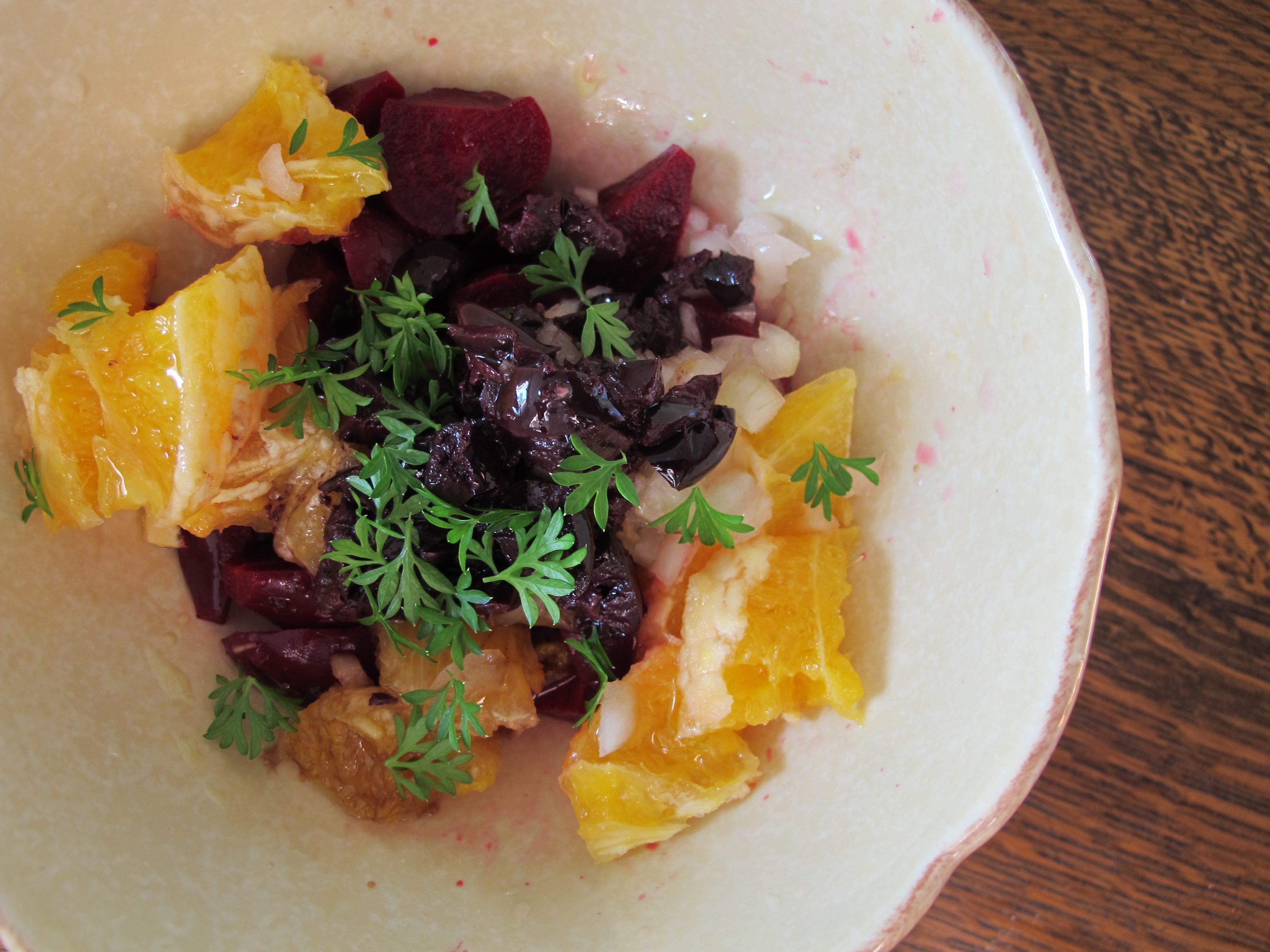 Cook the beets, let cool, and peel. Chop into quarters or eights. Peel the oranges, section, and chop into small chunks. Chop onion, parsley, and olives. Throw chopped ingredients, along with all the others, in a bowl and toss. Adjust seasoning to taste.
