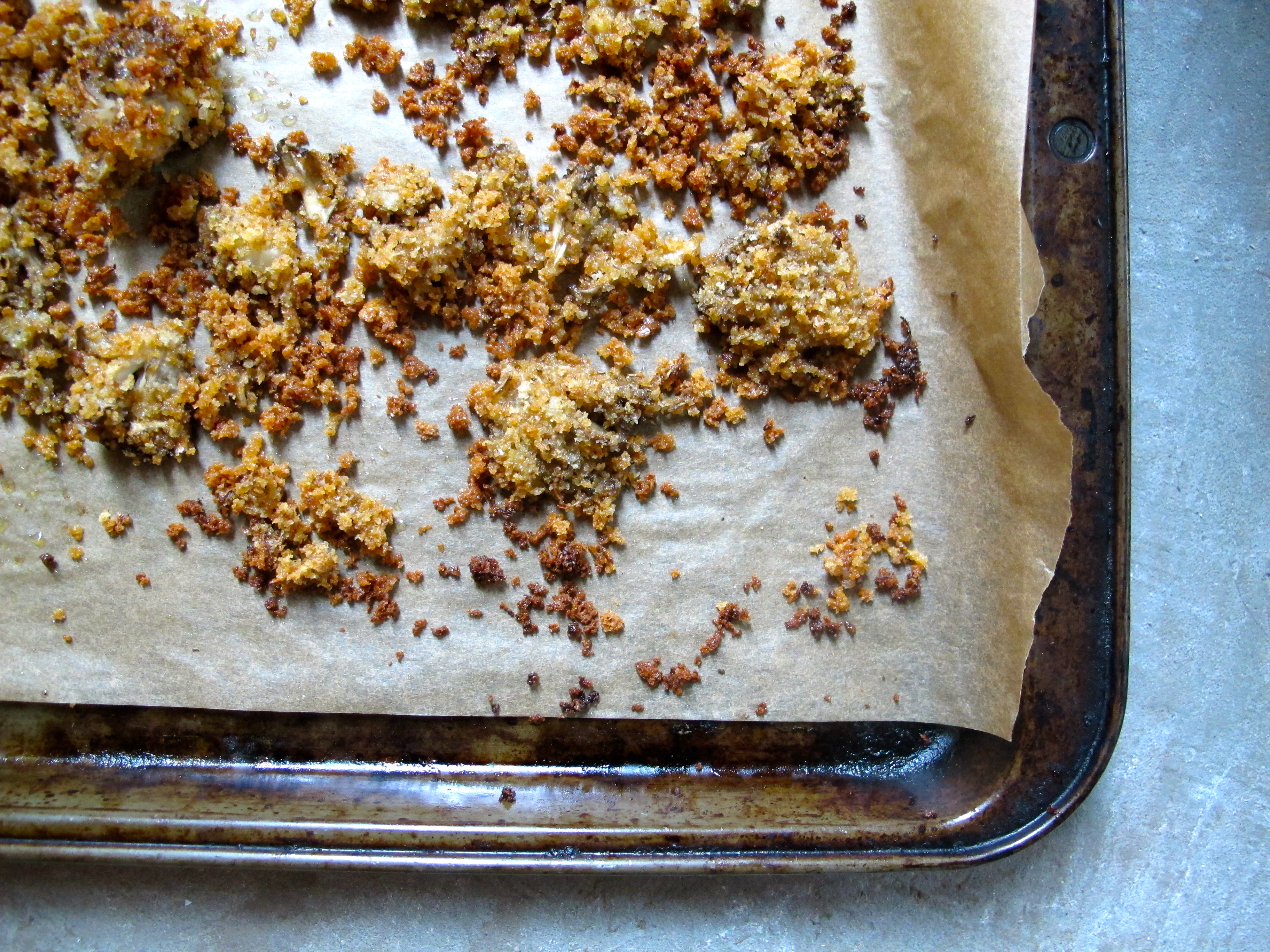 In a mixing bowl, combine olive oil and minced garlic. In a separate mixing bowl, combine bread crumbs and sea salt and pepper. Dip maitake in the olive oil mixture and then dredge in the bread crumbs being sure to let any excess oil drain off the mushrooms before dredging. Place on a baking sheet lined with parchment paper and bake at 400 degrees for about 20 minutes until they are sizzling and golden brown. When done, remove from the oven and let cool.