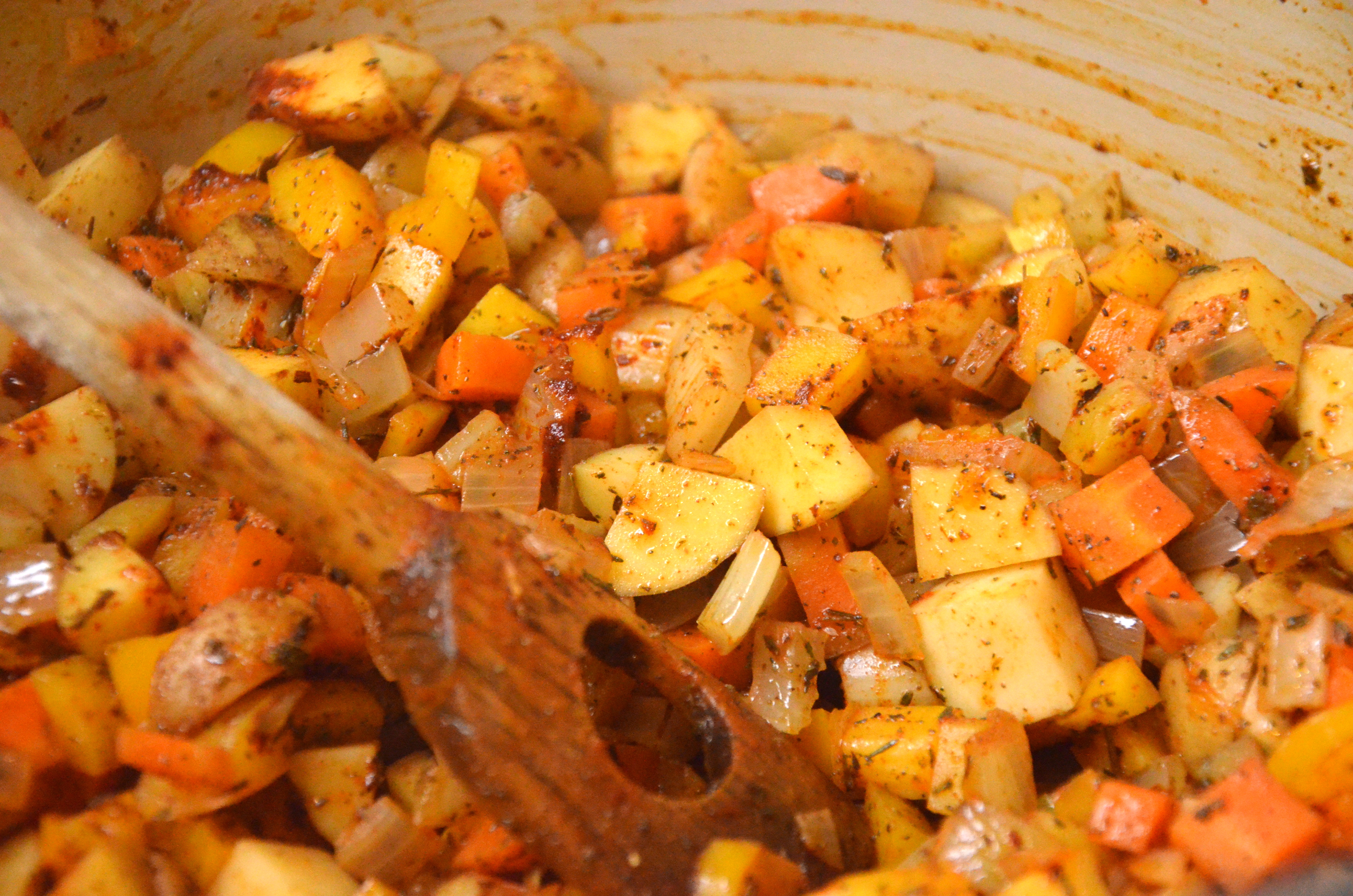 Meanwhile, heat the olive oil in a heavy-bottom pot. Add the onions and sauté until they start to soften. Add the carrots, celery, bell pepper, and potatoes. Sauté until the vegetables begin to soften. Add sage, thyme, smoked paprika, and bay leaves. Cook until the spices become fragrant. Add chickpea mixture and stir so everything becomes nicely blended.