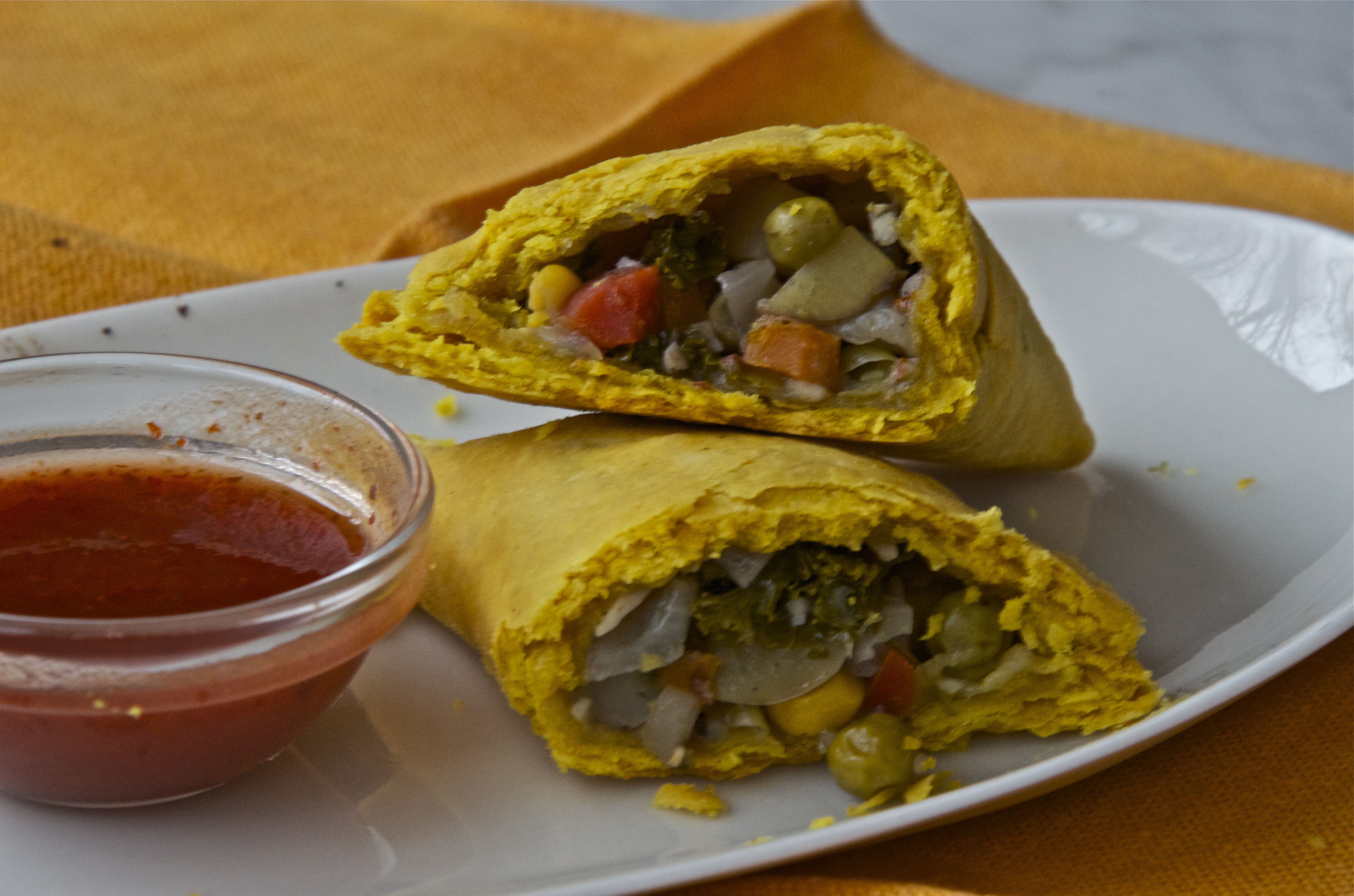 For the filling: In a medium-size saute pan over medium-low heat, combine the coconut oil, the onion, cinnamon, allspice, cumin, red pepper flakes, cayenne, and 1/2 teaspoon of salt. Saute, stirring occasionally, for 8 to 10 minutes, or until the vegetables are caramelized. Add the garlic and cook for an additional 2 minutes. Stir in the coconut milk, carrots, and potatoes, reduce the heat to low, cover, and cook until the carrots and potatoes are tender, 10 to 12 minutes. Stir in the green peas, corn, cabbage, thyme, and lemon juice, cover, and cook for 3 minutes more. Season with additional salt and the white pepper (or to taste) and set aside to allow the flavors to marry.