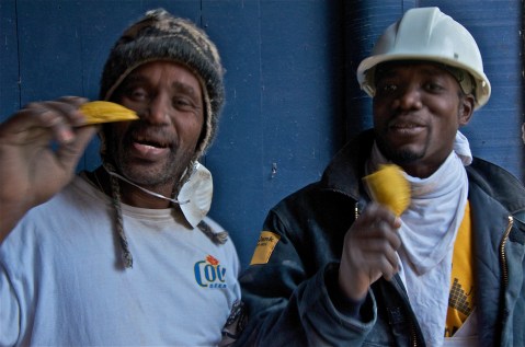 This is a bit of a long story … but the other day Sammy put in an order for Jamaican Meat Patties because he had them at a friend’s house and liked them. In soliciting suggestions for where to buy them in Toronto my friend, Pamela, challenged me to making my own Jamaican veggie patties. Of course I had to accept the challenge. So today I went out to get some ingredients and on my way back I bumped into my new buddies, Sam and Gordon, who are doing work on the house across the street. We struck up a conversation, I told them what I was up to, and they asked to be my official taste testers. Sam is from St. Vincent and Gordon is from Jamaica and I got 100% thumbs up from both of them which I take as a big endorsement. Sam even said he wasn’t dipping in the hot sauce because he only does that when the flavours aren’t good enough. Score.