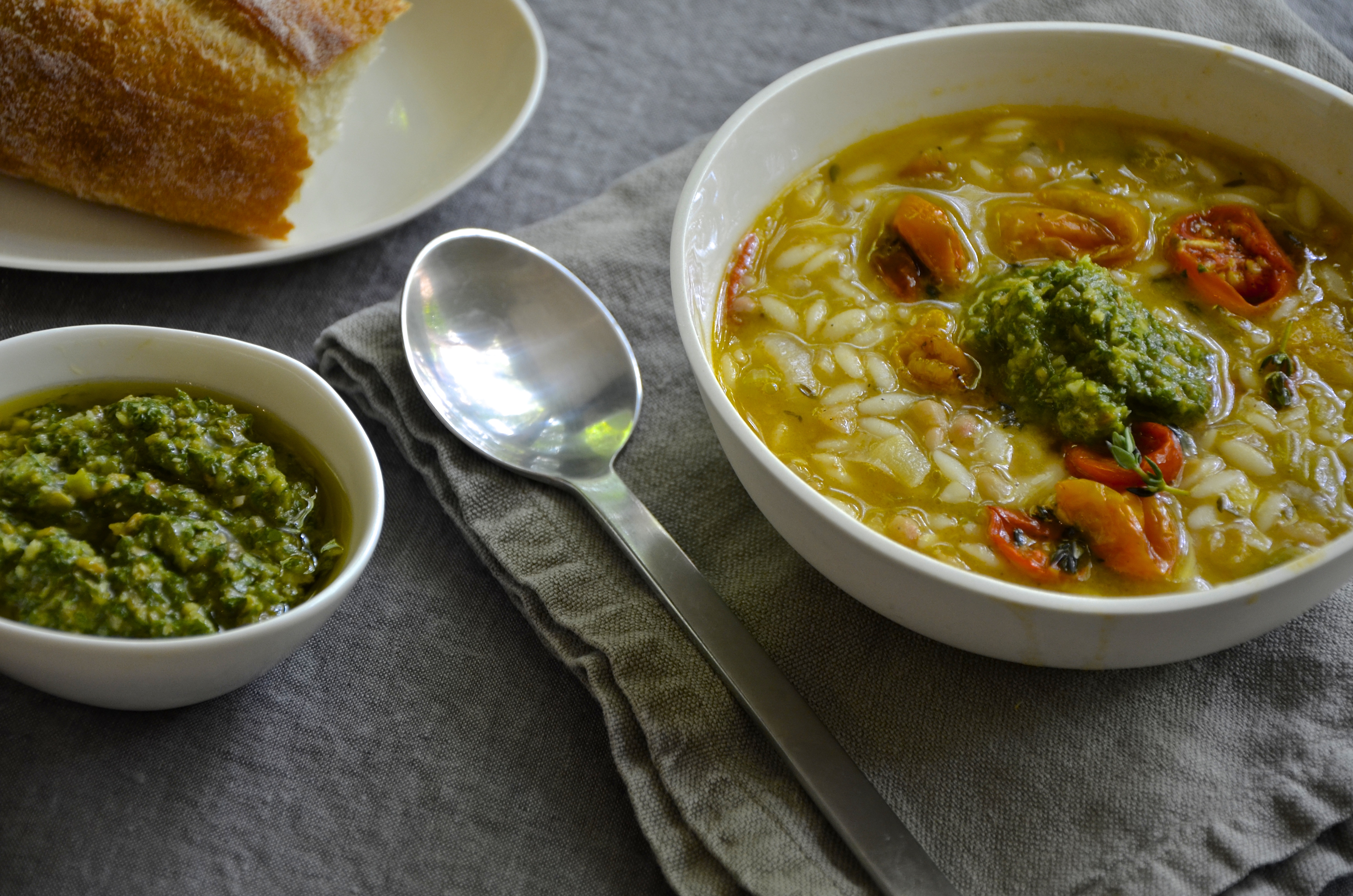 minestrone with sun-dried tomatoes and arugula salsa verde