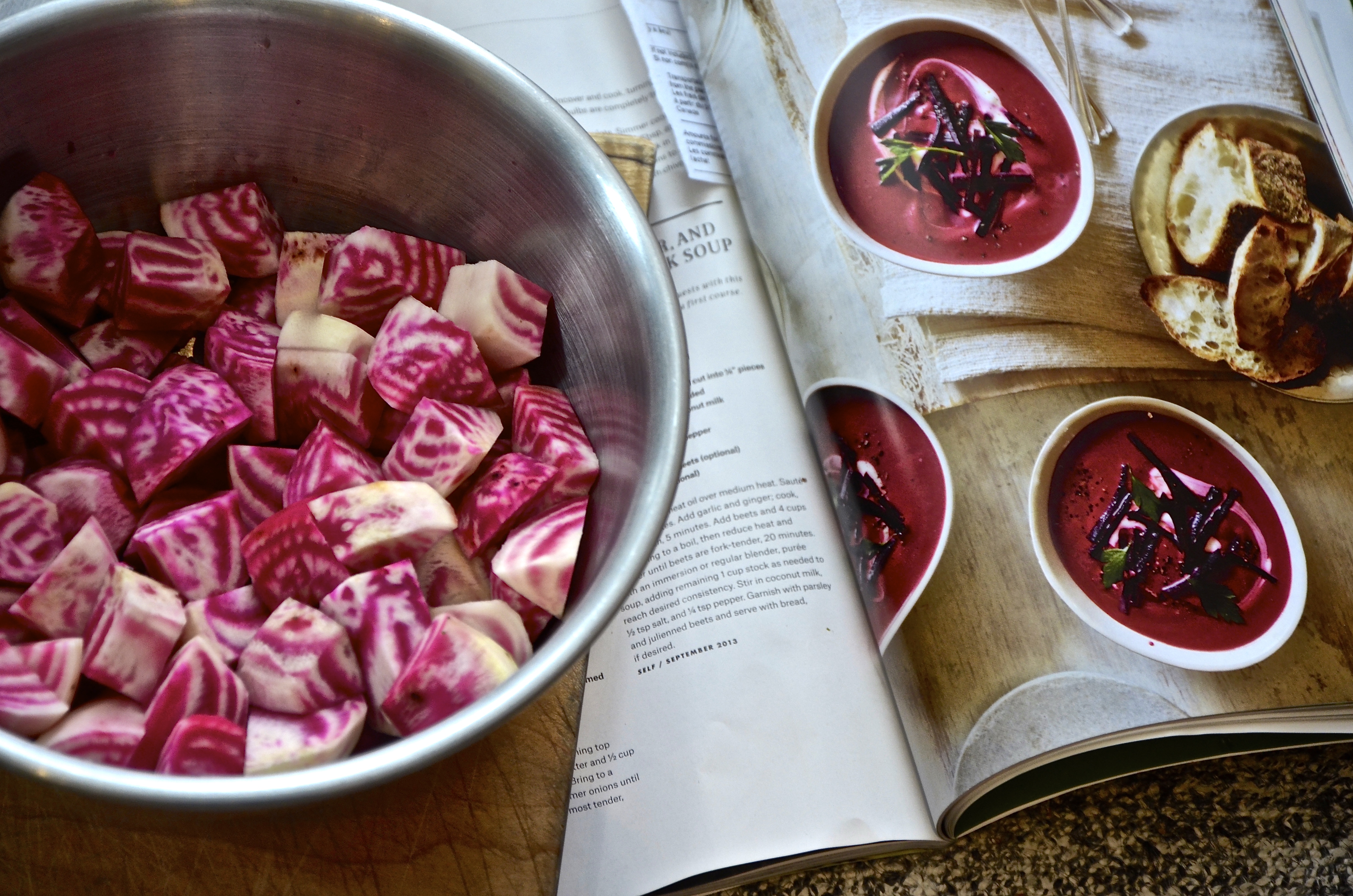 This is a recipe I found in Epicurious magazine. It called to me on this wintry day because soups are so hearty and warming, and beets so nourishing, and coconut milk and ginger so tasty together. It seemed the perfect concoction on a cold, snowy day. I used chioggia beets – also known as candy cane beets – which are an heirloom beet from the 19th century from the town of chioggia near Venice. You can use any beet you find or have or desire. The colour will change but the taste will be as earthy and sweet regardless.