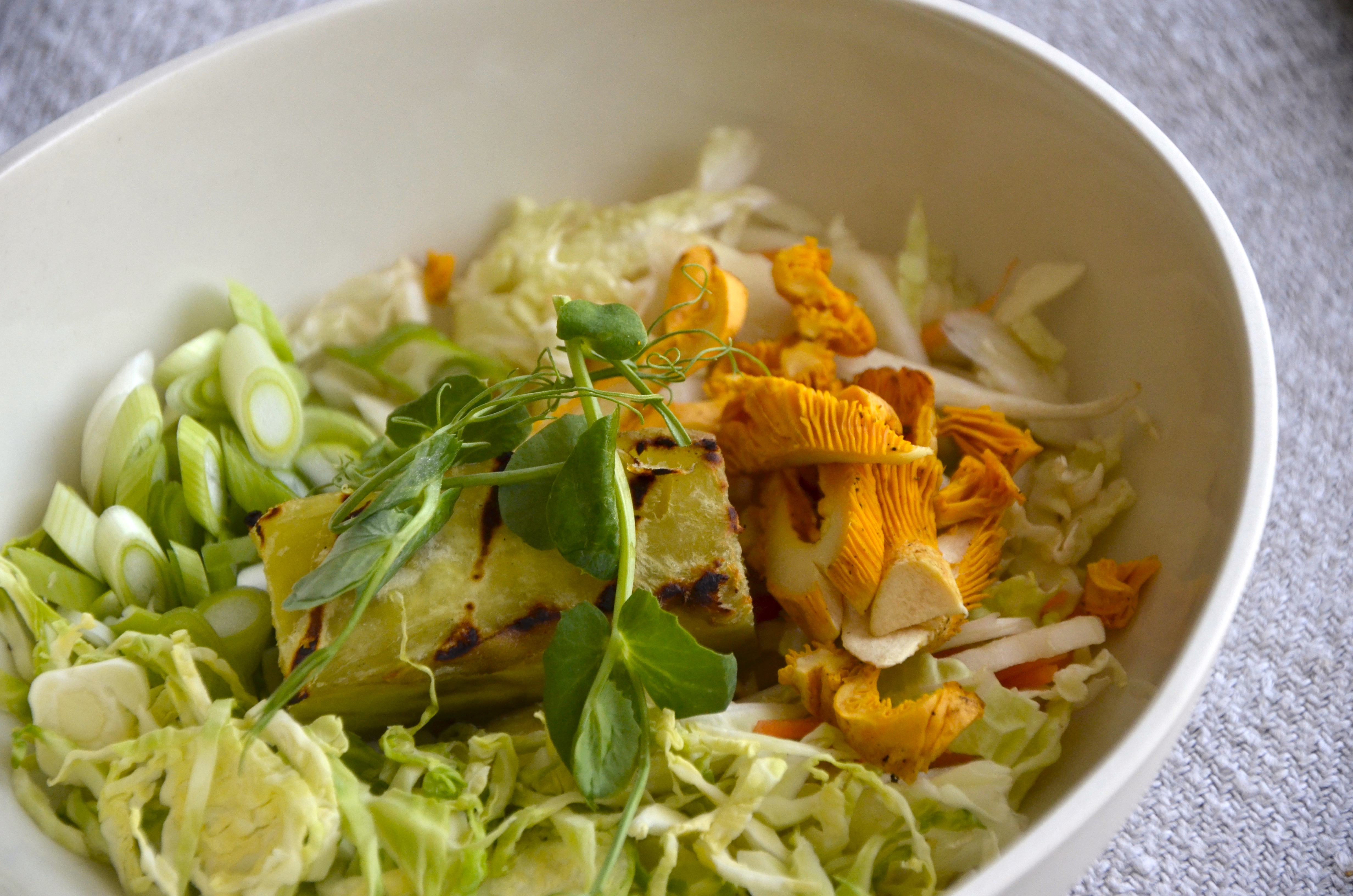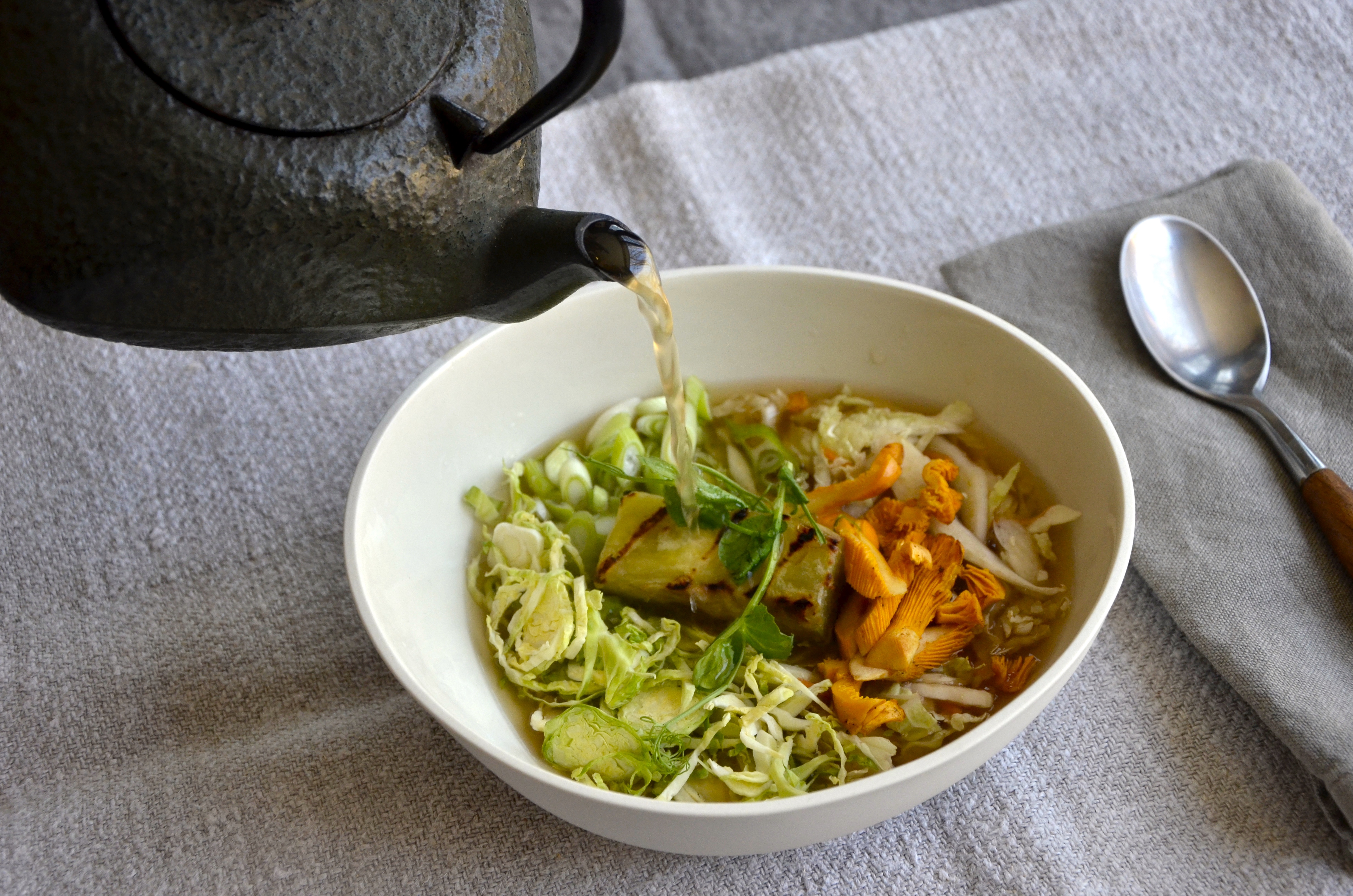Prepare your other vegetables and place them in the bottom of large soup bowls. Add the grilled satsumaimo. Finish with some tender shoots. Place vegetable bowls in front of hungry eaters and when everyone is seated and ready, pour smoked cabbage stock over the vegetables to the sounds of “oooohh” and “ahhhhhh.” Feel the satisfaction.