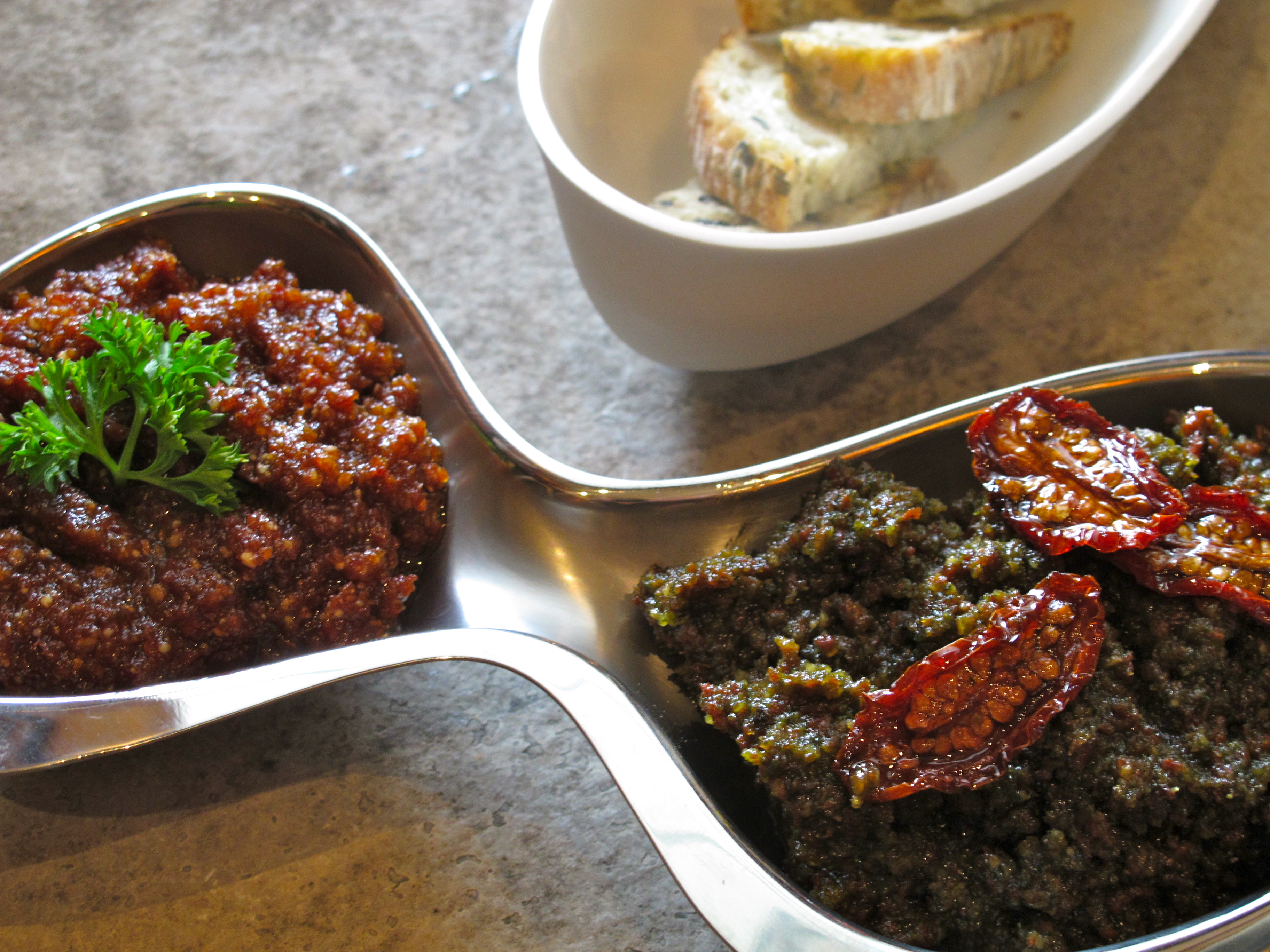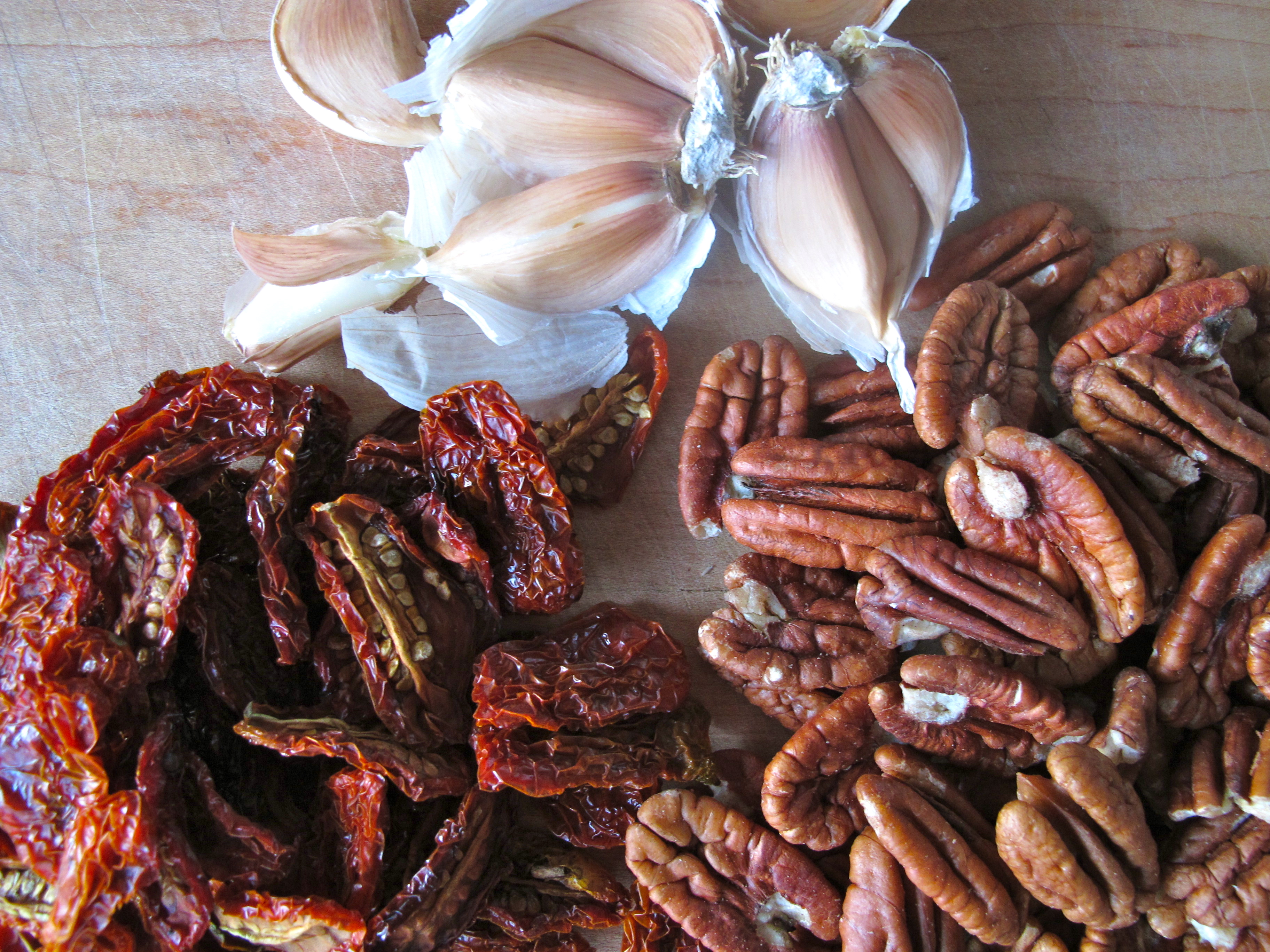 Everyone should have a few pestos and sauces loitering around in their fridge. They are so versatile and adaptable. We try to keep romesco, tapenade, and hummus on hand to spread on sandwiches, to snack on with a cracker when we’ve got the afternoon munchies, or to dollop on soup and stews like the fabulous Tuscan ribollita. This sun-dried pesto version is another option with either basil (on the right) or straight-up (on the left). With all the health benefits of basil – it being antioxidant, antiviral, antimicrobial, and “king of the herbs” as some like to call it – why wouldn’t you throw in a handful? But, the minimalist version is beautiful as well.