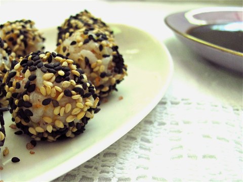 To form the balls, take a spoonful of rice and roll it out between your hands. It helps if your hands are damp (it is sticky rice after all!) so keep a bowl of water nearby to occasionally wet your hands so the rice doesn’t stick to you. Form all the balls and then roll the balls in the sesame seeds to lightly coat them. Refrigerate the balls until you are ready to serve. Let them sit at room temperature for about 10 minutes before serving.