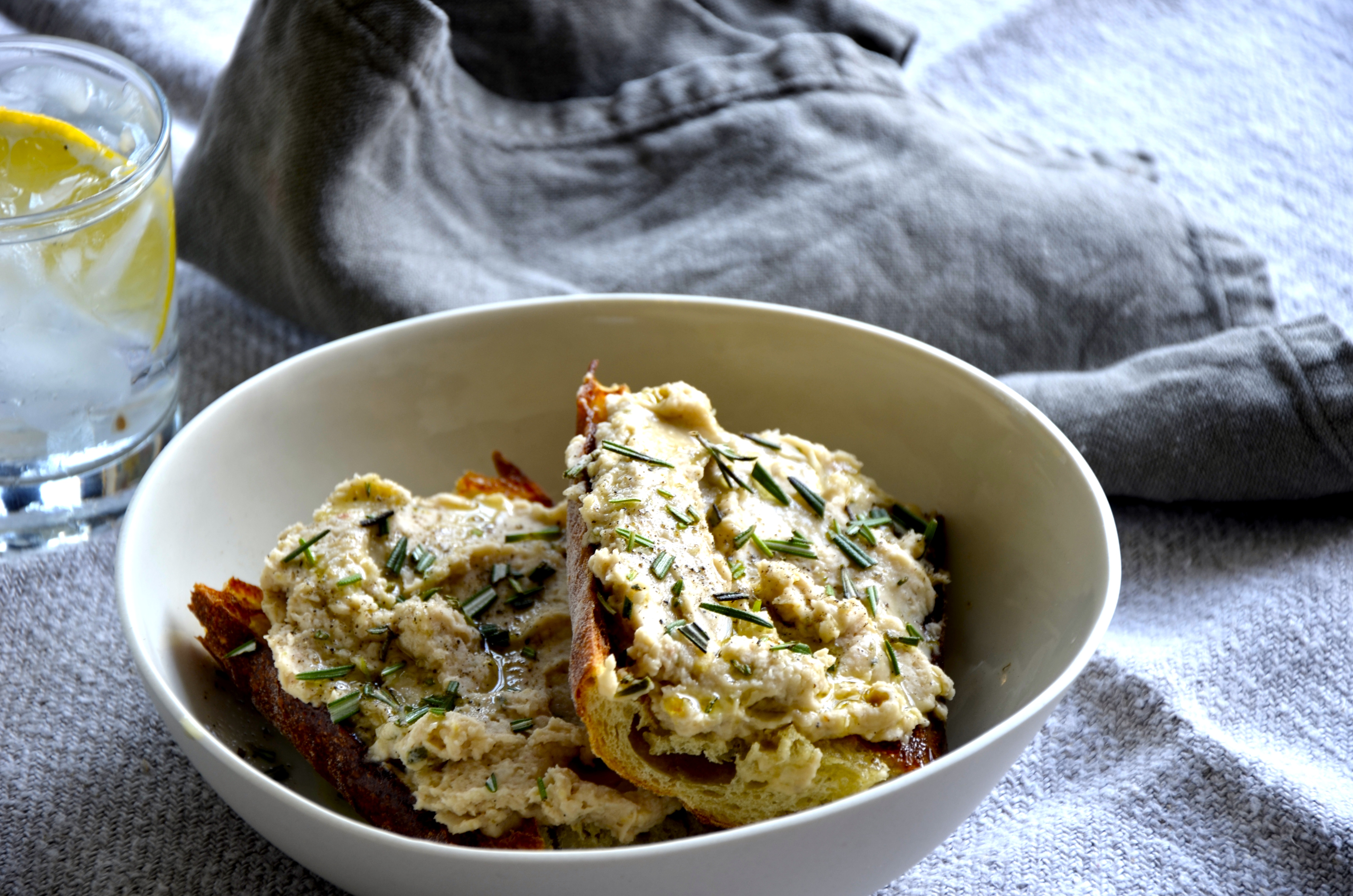 Heat the oil in a skillet, add the shallots, garlic, chopped rosemary, and lemon zest and cook over low, stirring occasionally, for about 5 minutes. Transfer the shallot mixture to a food processor, add all the remaining ingredients and process until smooth. Serve on toasted baguette, drizzle with olive oil, and garnish with a few rosemary sprigs.