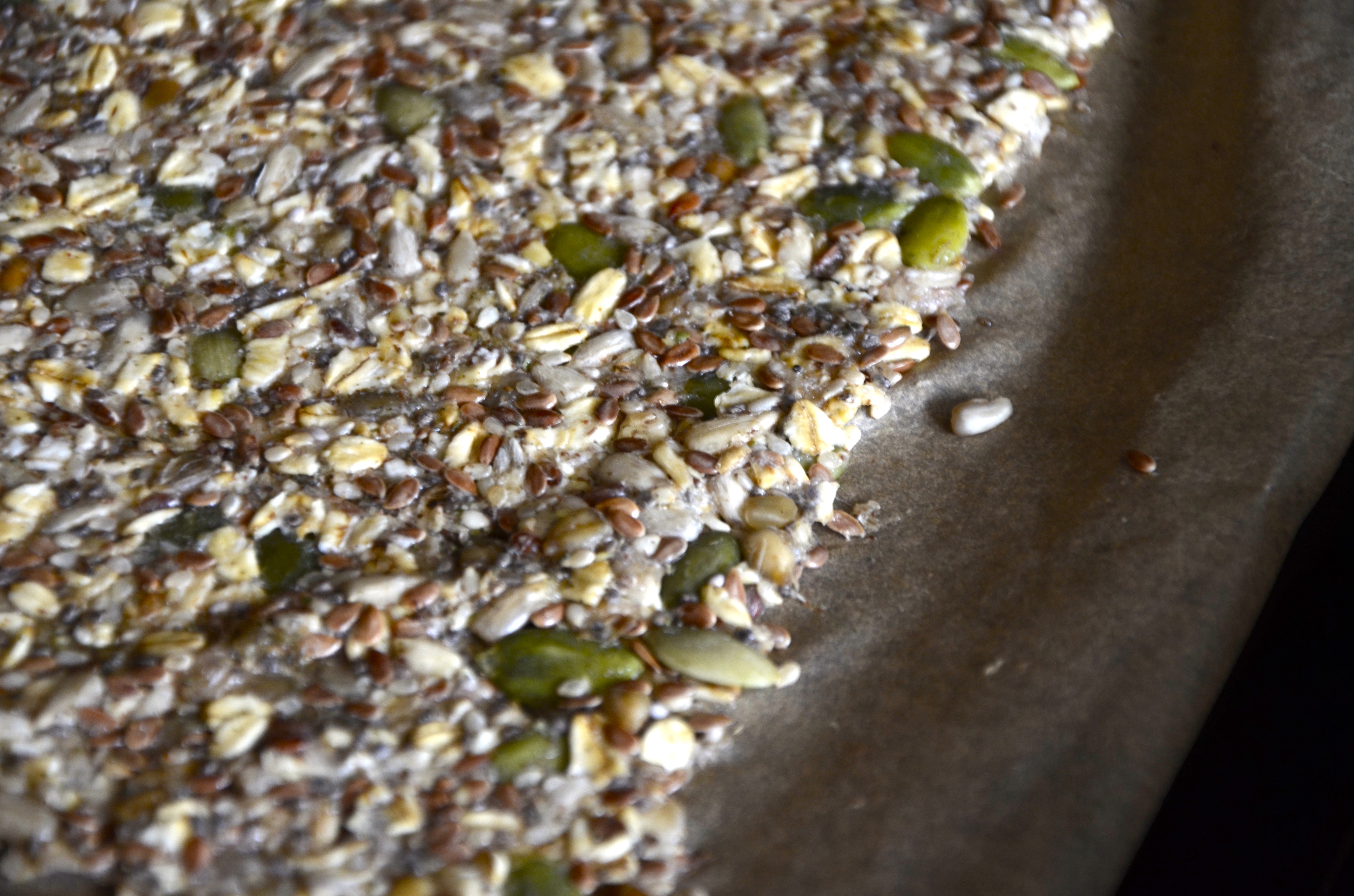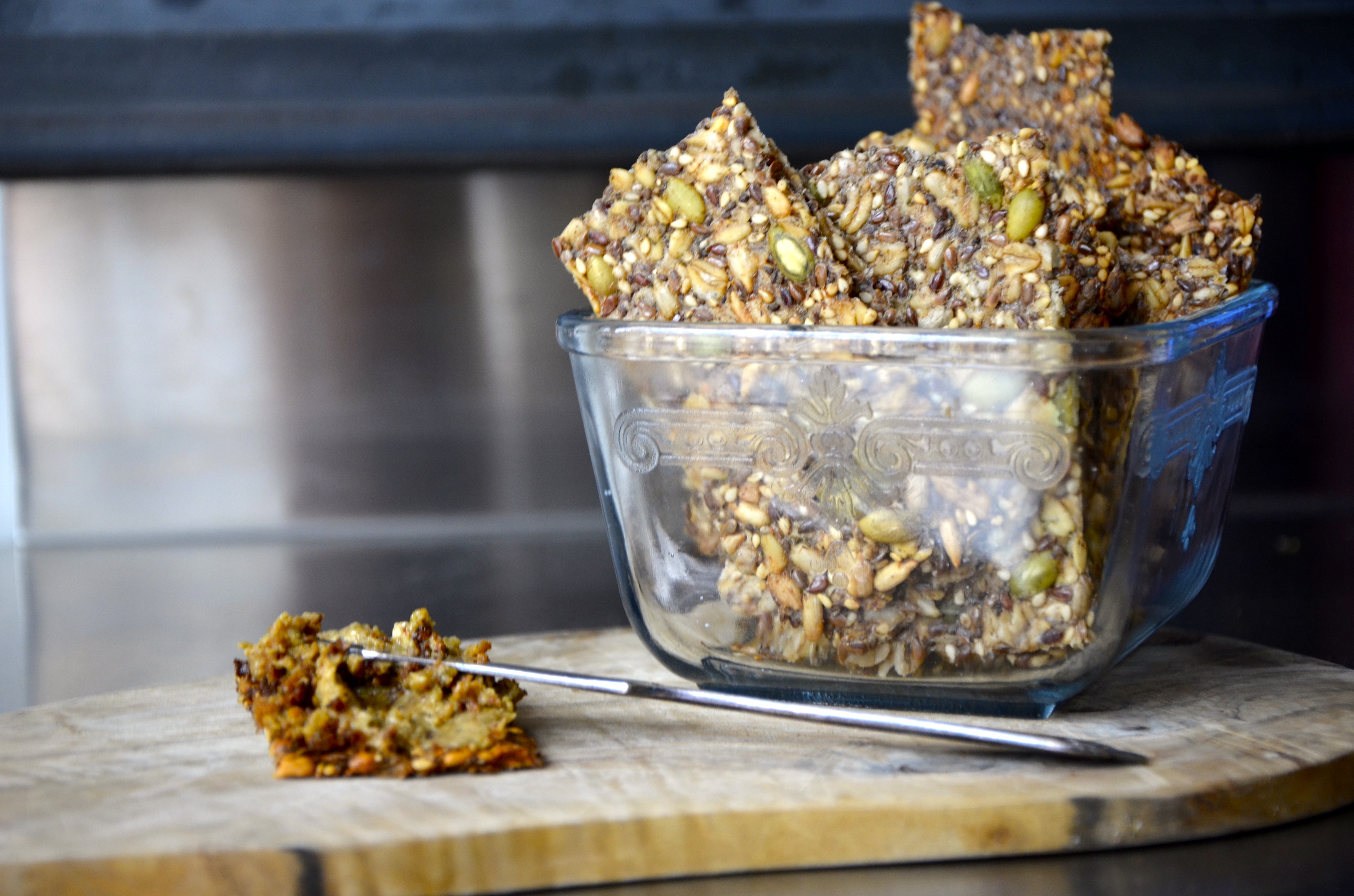 There is a beef in my house which is flying things unnecessarily from around the planet that we could easily get and/or make here. Fizzy water is one. Mustard is another. Crackers are high on the list as a third. So when Rebekah found this recipe for seedy crackers on My New Roots blog, which she loves, I thought I’d give them a try. They are kind of a cross between a cracker and a granola bar – full of oats and seeds and seasoning. The rosemary, garlic and smoked sea salt could be left out or replaced with any other seasoning that tickles your fancy. And with a little veggie pâté, hummus, or sun-dried tomato pesto, they eat like a feast.