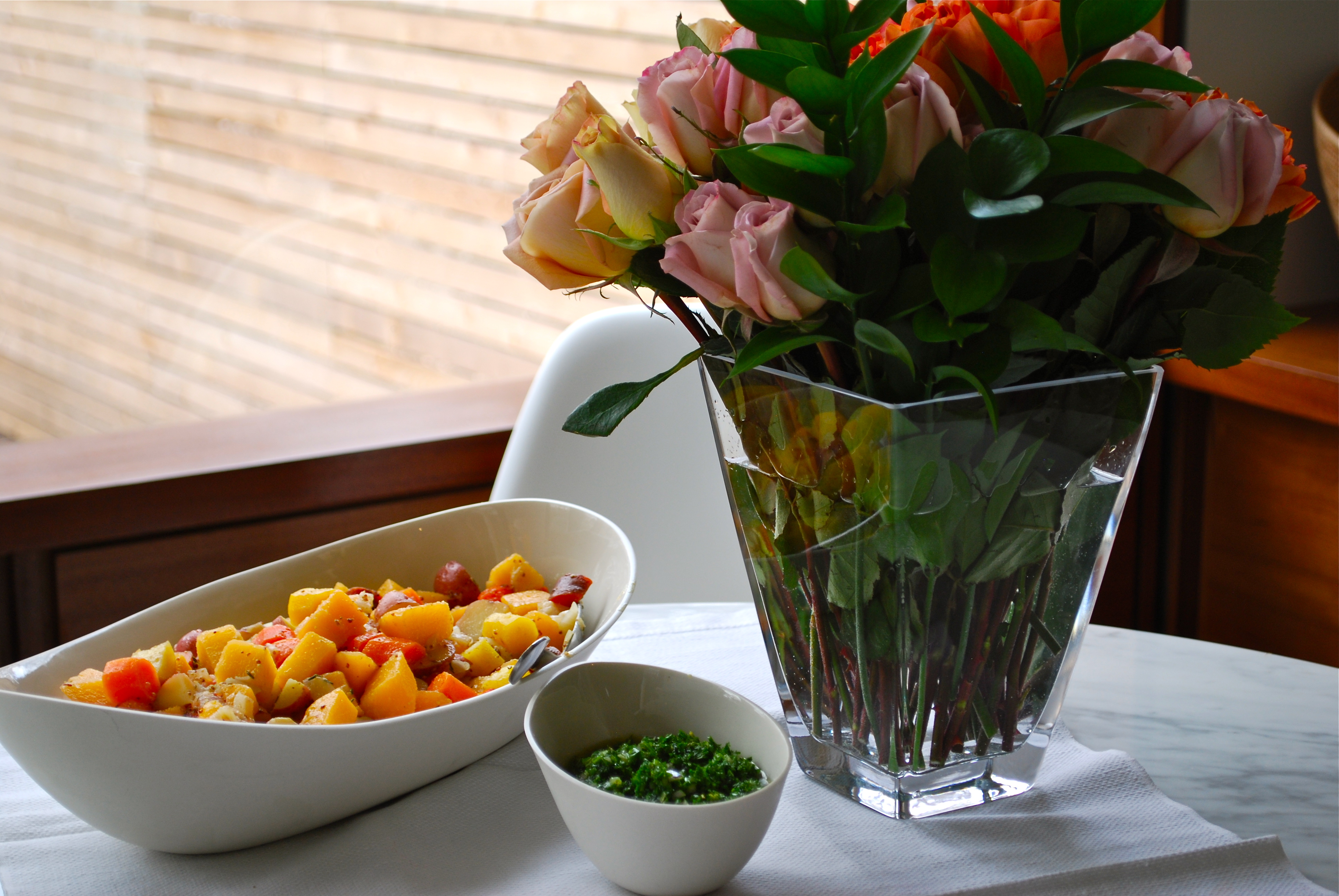 I’m invoking the spring. It’s April 1st and for many of you, you will be skipping amongst the tulips. But for us here in Toronto it’s windy, and cold, and – yes – snowing. Grumpiness abounds. So, to invoke the spring I’ve decided to clean out my fridge of all the winter hangers-on like rutabaga, carrots, and potatoes. Deborah Madison in her new (fabulous!) cookbook Vegetable Literacy, has the perfect recipe for these 3 rooty vegetables that are often relied upon to get us through the darkness of our darkest months. “Mustard grounds the sweetness of the vegetables” and a lovely parsley sauce contributes to the prayer for sun, warmth, and longer days with its green intensity and fresh springy taste. It’s goodbye winter. Hello spring. Bring on the fresh asparagus, spinach, and baby greens … after I finish another serving of the stew.
