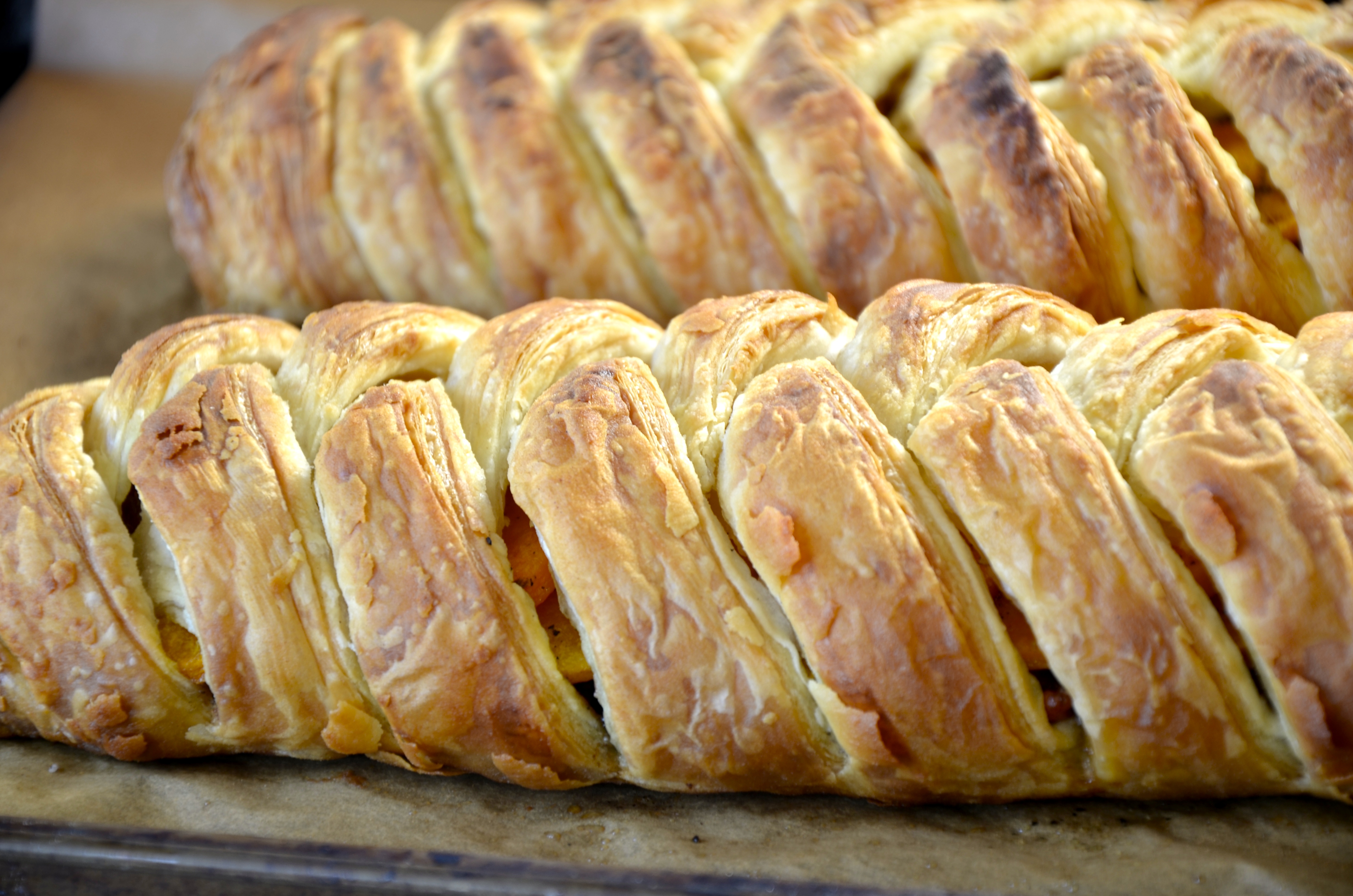Cut 1″ wide horizontal strips on either side of the filling. Fold strips on each side alternatively over the filling to create a braid. Brush with olive oil and sprinkle with a little fleur de del or some crushed dried thyme. Bake in the oven for 20 – 25 minutes until golden brown.