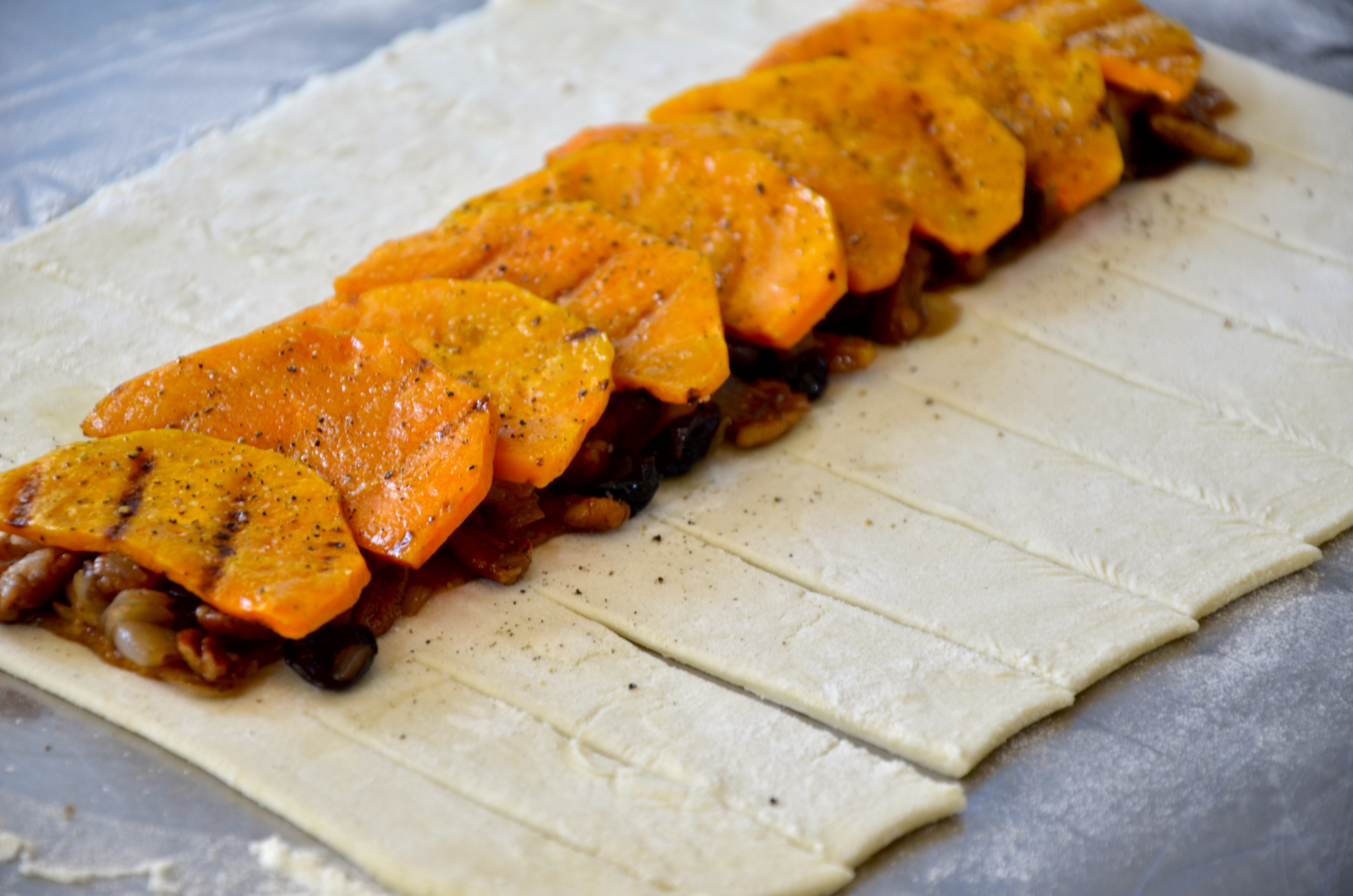 When ready, roll out puff pastry on a floured surface until you have a rectangle of 9″ x 12″. Spread mustard to cover the middle 1/3 of the pastry. Spoon onion mixture over the mustard. Place butternut squash slices on top of onion mixture. Sprinkle with sea salt and pepper to taste.
