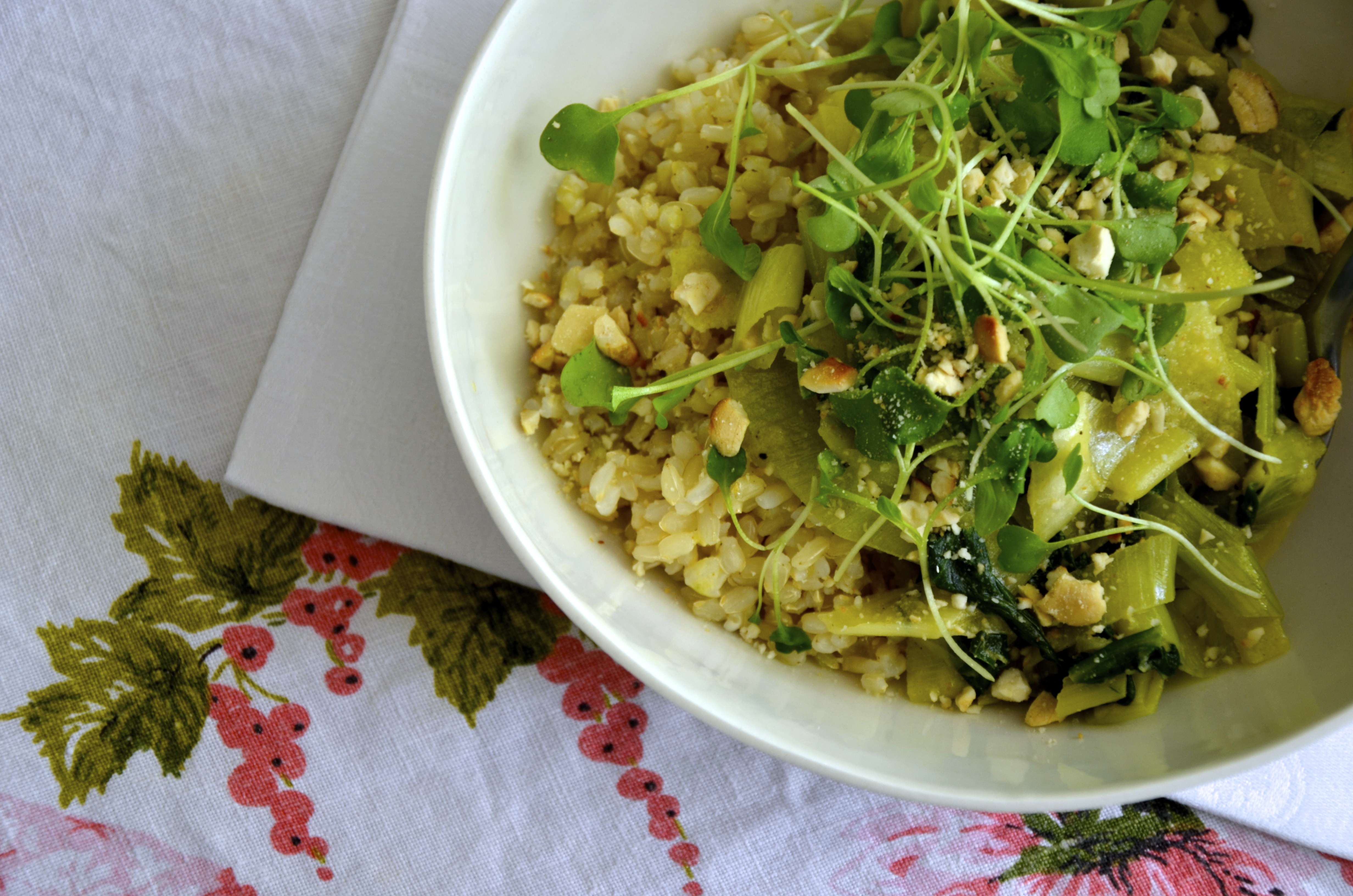 It’s spring and the farmers’ market is turning green with spinach, kale, chives, and all those fabulously welcome early greens. I bought a friend of mine River Cottage Veg for Christmas and she made this springy creamy leek and spinach dish for me one night. I pulled out the recipe this weekend thinking it was the perfect place for those spring greens to land. And it was. This is both fresh and hearty, with sweetness from the coconut milk and spiciness from the curry. On top of brown rice with a little nutty arugula and cashew garnish, you’ve got a meal that’s easy, filling, and healthful.