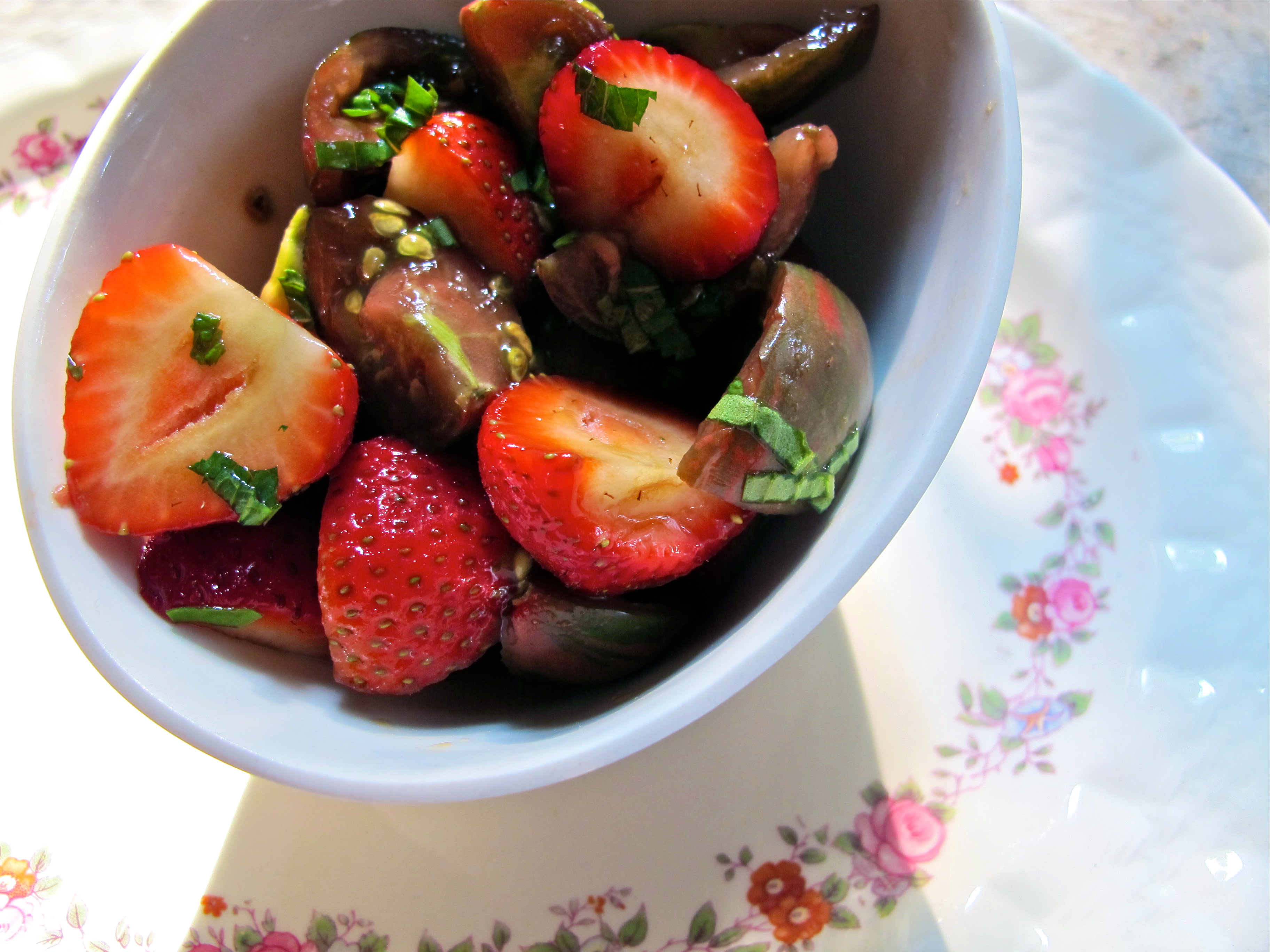 Mix the strawberries and tomatoes together in a bowl. Toss with balsamic vinegar, lemon juice, minced herbs, and pepper. Serve before or after dinner with a nice crisp white wine.