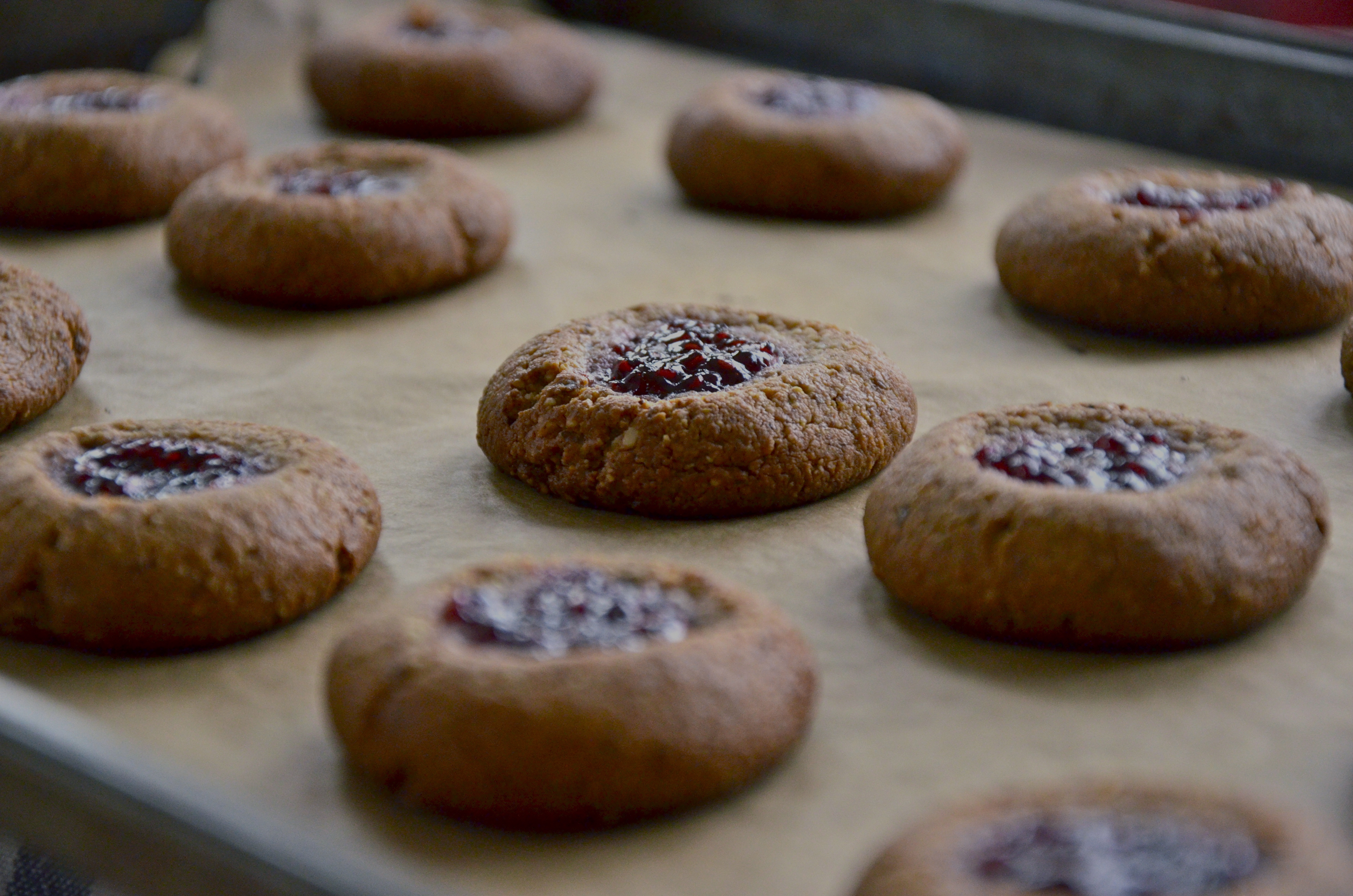Using a tablespoon to measure, scoop out some dough and form it into a ball. When the ball looks tight, put on cookie sheet lined with parchment paper and make an indent with your thumb. This is where you’ll put the jam. Repeat with the rest of the dough, then add the jam to each indent.