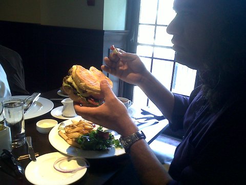Then, low and behold, my friend Michael Awad, photographer extra-ordinaire, suggested we go our for lunch at the crudacafe in St. Lawrence Market. Now, before I tell you about crudacafe you have to know that Mike is not a vegan. That’s him eating a really greasy, very large, totally unhealthy hamburger. But he suggested it and I wasn’t going to argue. I was amazed to find a totally cool woman, Claudia, serving up Butternut Squash Miso Soup, Wild Mushroom Nut Burgers, Enchiladas with flourless organic corn wraps, guacamole, spinach and marinated organic mushrooms, etc. It was fantastic! And in the basement of St. Lawrence Market no less, just a floor below the racks of curing hams, Italian Salamis, and ostrich steaks.