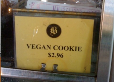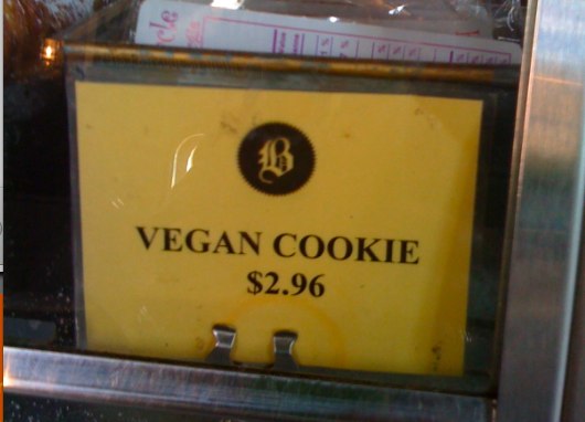 Vegan options are creeping into our day-to-day! They are around every corner. Okay, maybe not quite but I was struck by their increasing availability today because I was having coffee with a really smart guy named Rob Campbell of Smojoe at Balzacs in the Distillery District and there, as I stood in line for my soy milk latte, were vegan cookies.