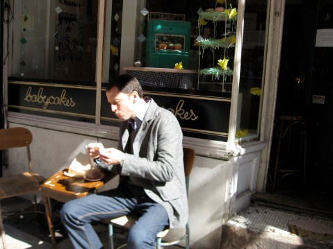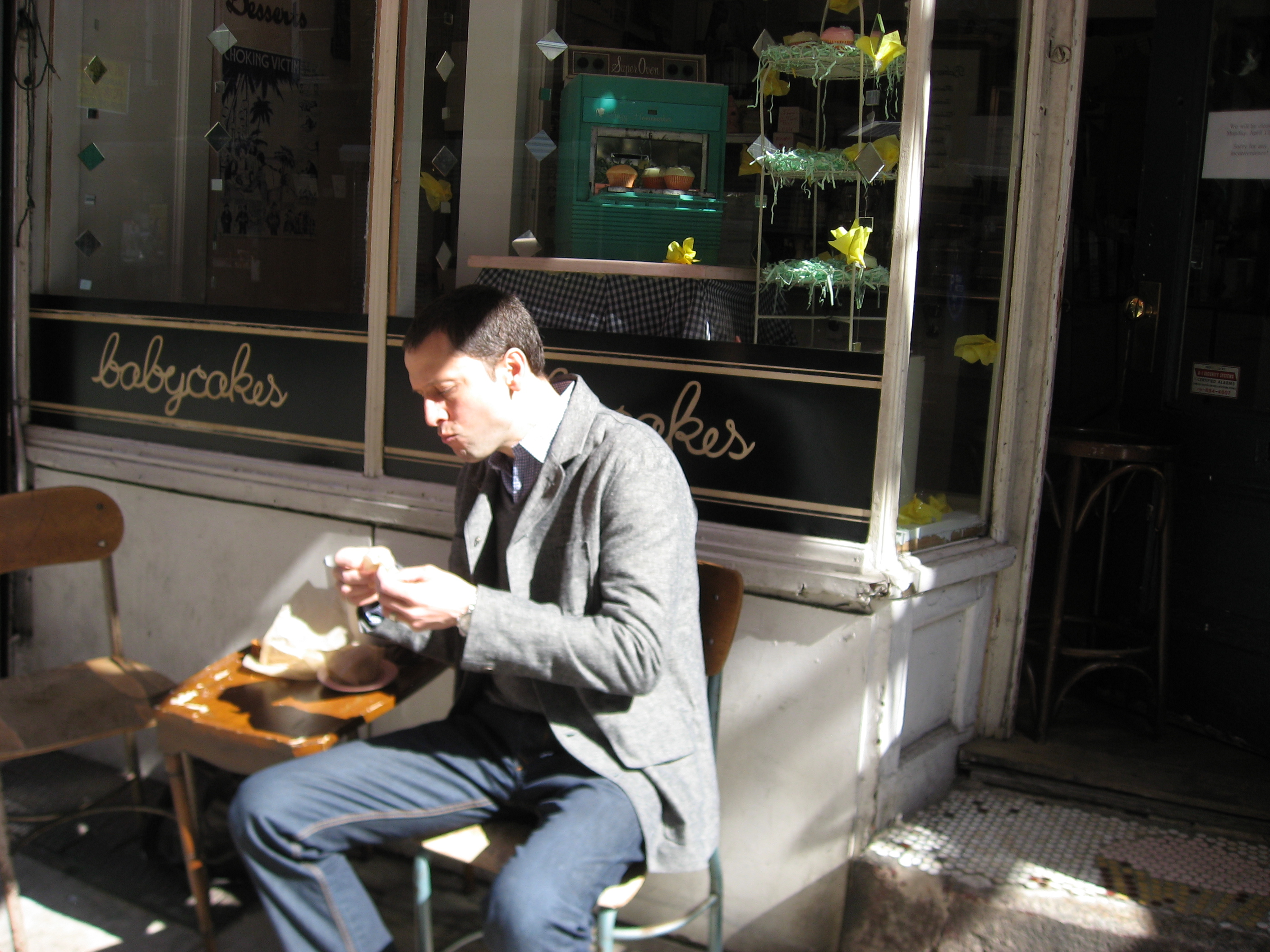 So Andrew and I went on our annual trip to NYC this past weekend (that’s him chowing down in front of Babycakes!). This was our first trip to NYC as (almost 100%) non-meat, non-dairy eaters. Now, as places-to-visit-as-a-vegan go, NYC isn’t a bad choice given the plethora of food establishments. Nevertheless I was pleasantly surprised that we did it!! Not 100% but 99% and that 1% diversion was by choice, not due to lack of options or desperation or thin resolve. It was a lot easier than I thought and as enjoyable, yummy, and satisfying as any other trip we’ve taken. A true v:gourmet trip to the Big Apple!!