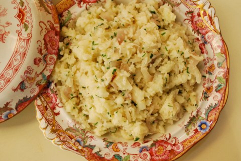 2. Warm the oil in a small skillet on medium-high heat and saute the shallots, garlic, salt and pepper until the shallots have softened. Add to the bowl of cauliflower and mash with a potato masher. Stir in the scallions and parsley. Stir in the grated cheese, if desired.