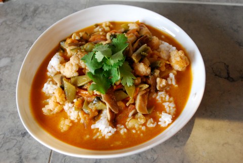 In a wide saucepan, add the coconut milk, sugar, and tamari. Add the curry paste – start with a small amount of curry paste and then taste for spiciness. Add more as desired. Add the cauliflower, green beans, mushrooms, red pepper, and half the basil. Simmer for 10 minutes. Garnish with remaining basil and serve with rice.
